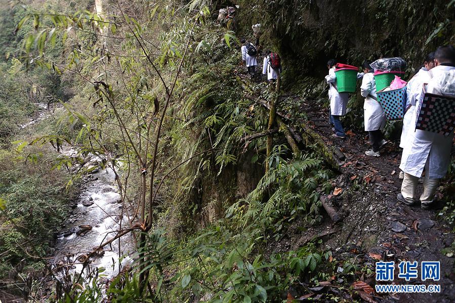在云南怒江贡山县丙中洛镇,医疗队员在山间道路上前行(1月12日摄)。 新华社记者张加扬 摄