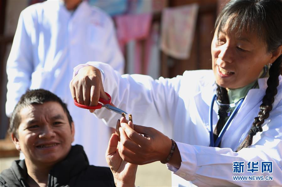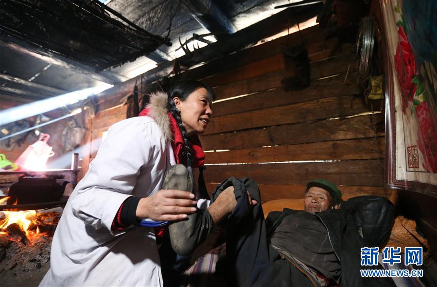 在云南怒江贡山县丙中洛镇小查腊村,管延萍(右)为村民学罗军修剪指甲(1月14日摄)。新华社记者张加扬 摄