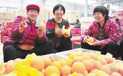 电商平台已成为消费者购物的重要渠道。图为在湖北省宜昌市夷陵区电商产业园,一家农产品供应链公司员工在对网购鲜橙打包装箱。