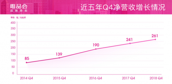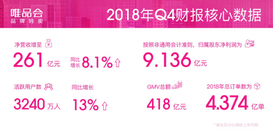 北京时间2月21日凌晨,美股上市的特卖电商唯品会(vip.com,NYSE:VIPS)披露了其未经审计的2018年第四季度财务报告,财报数据显示,唯品会四季度净营收增至261亿人民币(约合38亿美元),活跃用户同比增长13%。唯品会实现第25个季度连续盈利,客群数量与质量得到全面增长。