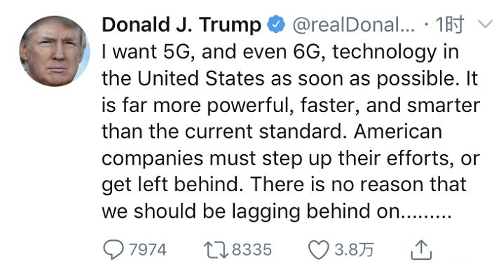 我希望美国尽可能快地发展5G,甚至6G技术,那会比当前的标准更强、更快、更智能。美国公司必须加紧努力,否则就会落后。在那些明显代表未来的领域,美国没有被人甩在身后的理由。我希望美国公司能够通过竞争去获胜,而不是靠封杀当下更先进的技术。不论在我们从事的哪个领域,美国都必须是领导者,尤其是在令人兴奋的科技世界!