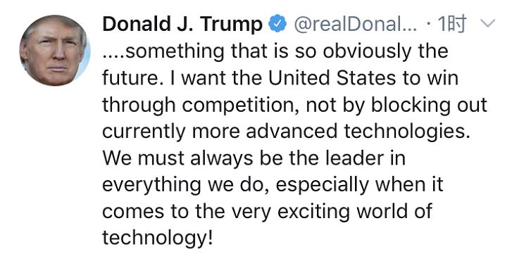 请注意特朗普的这句话:我希望美国公司能够通过竞争去获胜,而不是靠封杀当下更先进的技术。