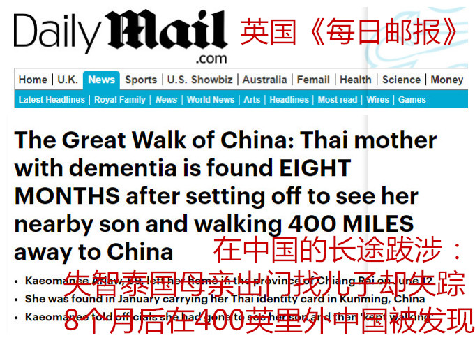 让两国警方都不解的是,患有老年痴呆的卡欧曼尼是如何从清莱来到600多公里外的昆明的?对于这点疑问,卡欧曼尼说她只隐约记得自己一直在步行,曾经穿越了森林。