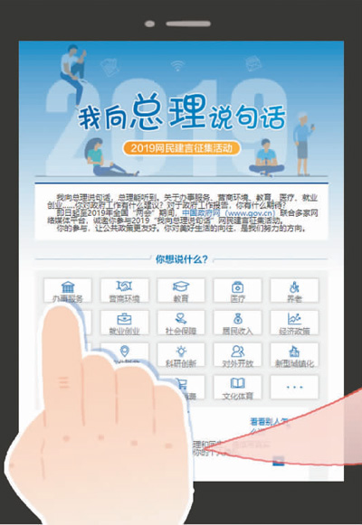 “我向总理说句话,总理能听到。”2019年,“我向总理说句话”栏目,依然发挥着重要的桥梁作用,本次征集设有“办事服务”“营商环境”“教育”“医疗”“创业就业”等20类话题。对于这些问题,网友们反响热烈:有的网友关心农业农村方面,提出“希望国家管控农村存在的过度使用化肥、除草剂、灭虫剂的问题”;有的网友心系医疗问题,“希望政府能够进一步完善覆盖全社会的一整套新生儿缺陷和残疾防控体系,提高整体人口素质”;有的网友想了解创业就业方面的政策,“希望能够出台相关女性创业或者就业政策,减少女性工作压力”;还有的网友关注社会保障,“作为一名‘外卖小哥’,我特别关注自身职业风险保障问题”…… 活动上线2个月,收到各渠道报送的网民建言已超过20万条。