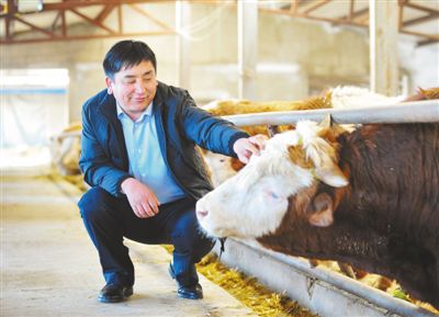 全国人大代表、内蒙古自治区扎鲁特旗巴彦塔拉苏木东萨拉嘎查党支部书记吴云波在查看合作社的肉牛养殖情况。新华社记者 彭 源摄
