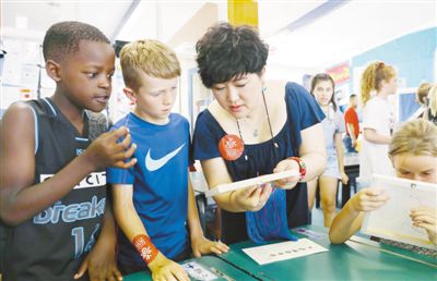 全国人大代表、非物质文化遗产——渤海靺鞨绣第四代传承人孙艳玲(左三)介绍靺鞨绣技艺。新华社发