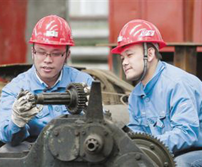 全国人大代表、山西焦煤集团西山煤电公司杜儿坪矿掘进一队副队长董林(左)为职工讲解设备构造和传动原理。新华社发