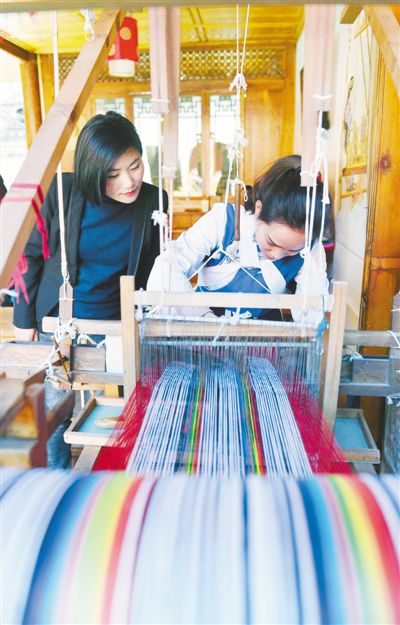 全国人大代表、云南省丽江市文化馆副馆长范永贞(左)调研纳西族民间纺织工艺,了解少数民族群众发展传统文化产业脱贫致富情况。新华社记者 杨宗友摄