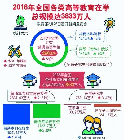 2018年,全国共有普通高校2663所(含独立学院265所),比上年增加32所。其中,本科院校1245所,比上年增加2所;高职(专科)院校1418所,比上年增加30所。另有研究生培养单位815个。各种形式的高等教育在学总规模3833万人。