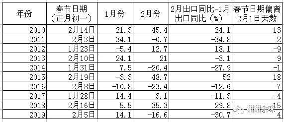 海关总署2010-2019年前2个月的出口数据,正好可以印证这一规律(见下表)。