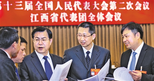3月10日,人大江西代表团举行全体会议。会议结束后,全国人大代表曾文明(左三)、马叶江(右二)、许锐(右一)就持续推进污染防治等话题展开讨论。经济日报-中国经济网记者 刘 兴摄