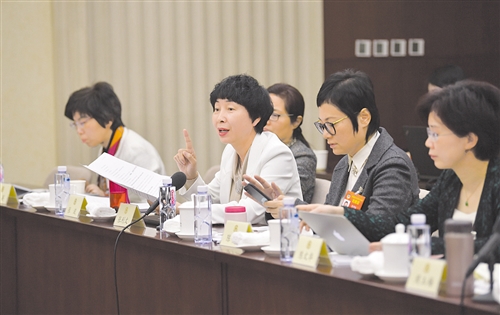 3月10日,全国政协妇联界别在驻地举行小组会议。全国政协委员张利文(左二)认为女性应为守住青山绿水蓝天、共建美丽中国作出贡献。经济日报-中国经济网记者 高兴贵摄