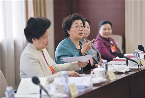 3月10日,全国政协妇联界别在驻地举行小组会议,讨论政协工作。全国政协委员崔郁(左二)认为,应保证女性在基本医疗卫生服务方面有更多获得感。经济日报-中国经济网记者 高兴贵摄