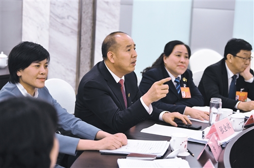 3月10日,人大河南代表团举行全体会议,审议外商投资法草案。会上,全国人大代表张全收(右三)就保障用工人员基本医疗卫生服务发言。经济日报-中国经济网记者李景录摄