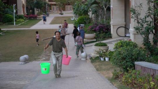 记者在现场看到,已建成交付的公寓共9栋,每栋26层。记者进入其中两栋,每层为三梯10户,另有两栋在建;其外,还有别墅区域。很多家的门上贴上了红色春联,有的还留存着政府执法时贴上的白色封条。由于停水、没有物业管理,小区里的植物在日复一日地阳光照晒下失去了精神,垂下了枝叶,目前还住在里面的居民只能下楼用水桶挑水来解决用水问题。