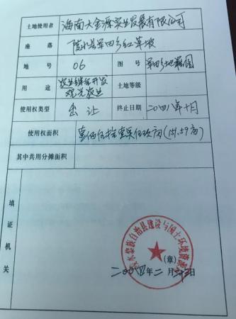 在记者的要求下,陵水县国土环境资源局拿出了涉案土地留档的国有土地使用证,海南大金源在2004年2月拍得的数幅地块用途为农业综合开发及观光农业,终止日期为2048年10月。