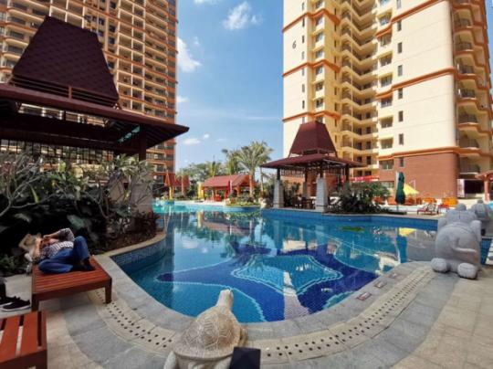 2018年交付使用的小区没有让购房人失望,业主们向澎湃新闻提供了刚刚入住时的照片:图片上,阳光和煦,游泳池水清澈,居民惬意地在周边躺椅上休息。