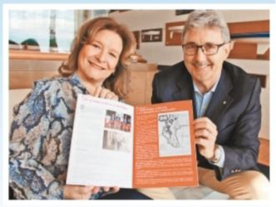 摩纳哥记者协会副主席钦齐亚·斯甘巴蒂—科尔曼和丈夫展示杂志中与中国相关的报道。本报记者 冯雪珺摄