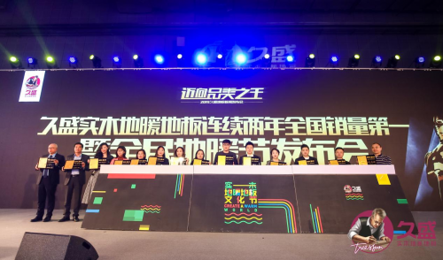 3月27日,久盛地板于上海虹桥国家会展中心举办“迈向品类之王——2019久盛地板新闻发布会”,三大品牌消息全国首发:联合全球权威认证机构欧睿国际发布“久盛实木地暖地板连续两年全国销量第一”、联合中国林业科学研究院木材工业研究所共同发布 “《地采暖用实木地板》全国首发仪式”以及“久盛实木地暖地板文化节温暖启幕”。