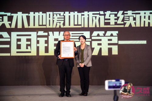 穆愔女士现场对销量第一认证做出解读,表示该认证是基于久盛的定制类调研,对国内地暖地板进行的深度访谈所获得的第一手数据得出的数据答案,久盛是目前国内实木地暖地板第一的品牌。久盛地板营销总经理赵兴才代表久盛地板接受由欧睿国际大中华区高级总监穆愔女士颁发的《2018全国销量第一认证》。