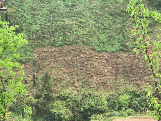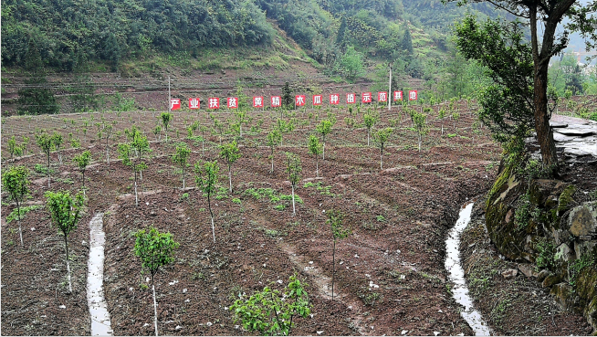 △这是2017年底种下的木瓜树苗。预计明年秋天它们可以挂果。漫山遍野的木瓜树在花期既美丽又是很好的蜜源,促进当地的生态旅游和蜂蜜产业,可以一举多得。(央视记者黄京辉拍摄)