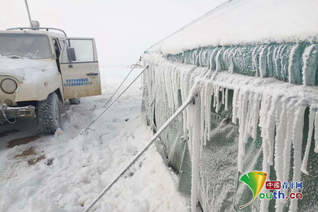 由于寒冷,巡山队的帐篷和车辆上都结上了厚厚一层冰。受访者供图