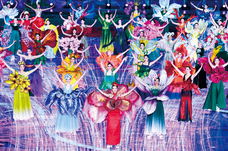 2019年4月28日,世界园艺博览会开幕式在北京延庆举行。在以“美丽家园”为主题的文艺晚会上,中国古典舞《彩蝶的虹桥》,以翩翩起舞的蝴蝶展现了大自然的五彩斑斓。各国模特身着参展国的名花图案服饰,用五彩缤纷的花语共叙友谊。图为演出现场。 新华社记者 申宏/摄