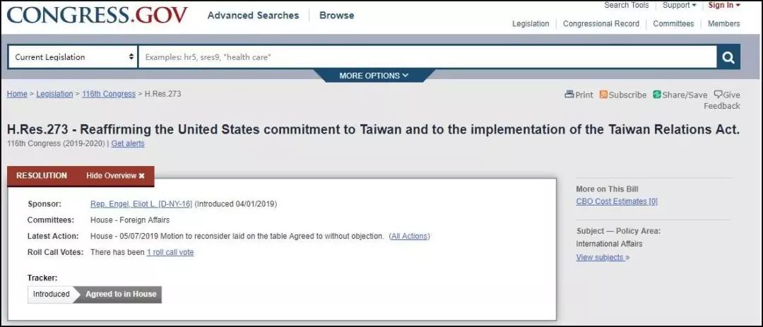 5月7日,美国众议院针对“台湾保证法2019”进行投票