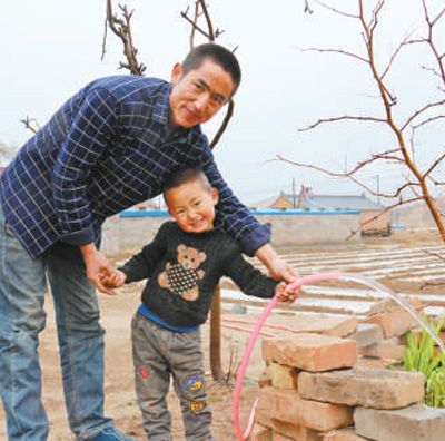 36岁的西吉县兴平乡团结村村民王五旦和儿子展示自来水。本报记者 禹丽敏摄