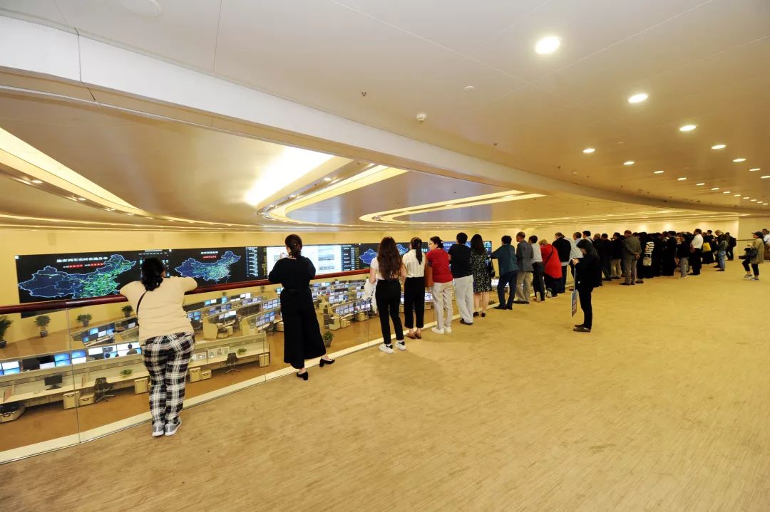 11时许,外宾代表抵达铁路总公司调度指挥中心大厅。站在应急指挥平台上放眼望去,调度指挥中心的大型显示屏格外引人注目,旅客列车实时在途分布情况、旅客发送态势、货运装车态势和中欧(中亚)班列运行情况一目了然,屏幕上跳动的数字彰显中国铁路的生机和活力。对此,外宾代表直呼大开眼界、不可思议,纷纷拿出手机拍照留念。