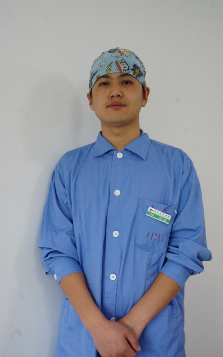 拨通陈二辉电话后,一个脚穿洞洞鞋,身着蓝色护士服,戴着一顶大嘴猴印花图案护士帽的人,从重症监护室里探出身来。帽子下的男人,长着一张娃娃脸。