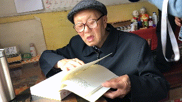 ↑张富清老人每天午休起来后,都要看书读报,坚持学习。