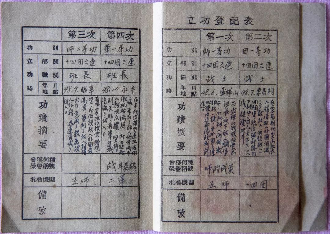 泛黄的登记表上记录了张富清在西北野战军4次立功的经过:
