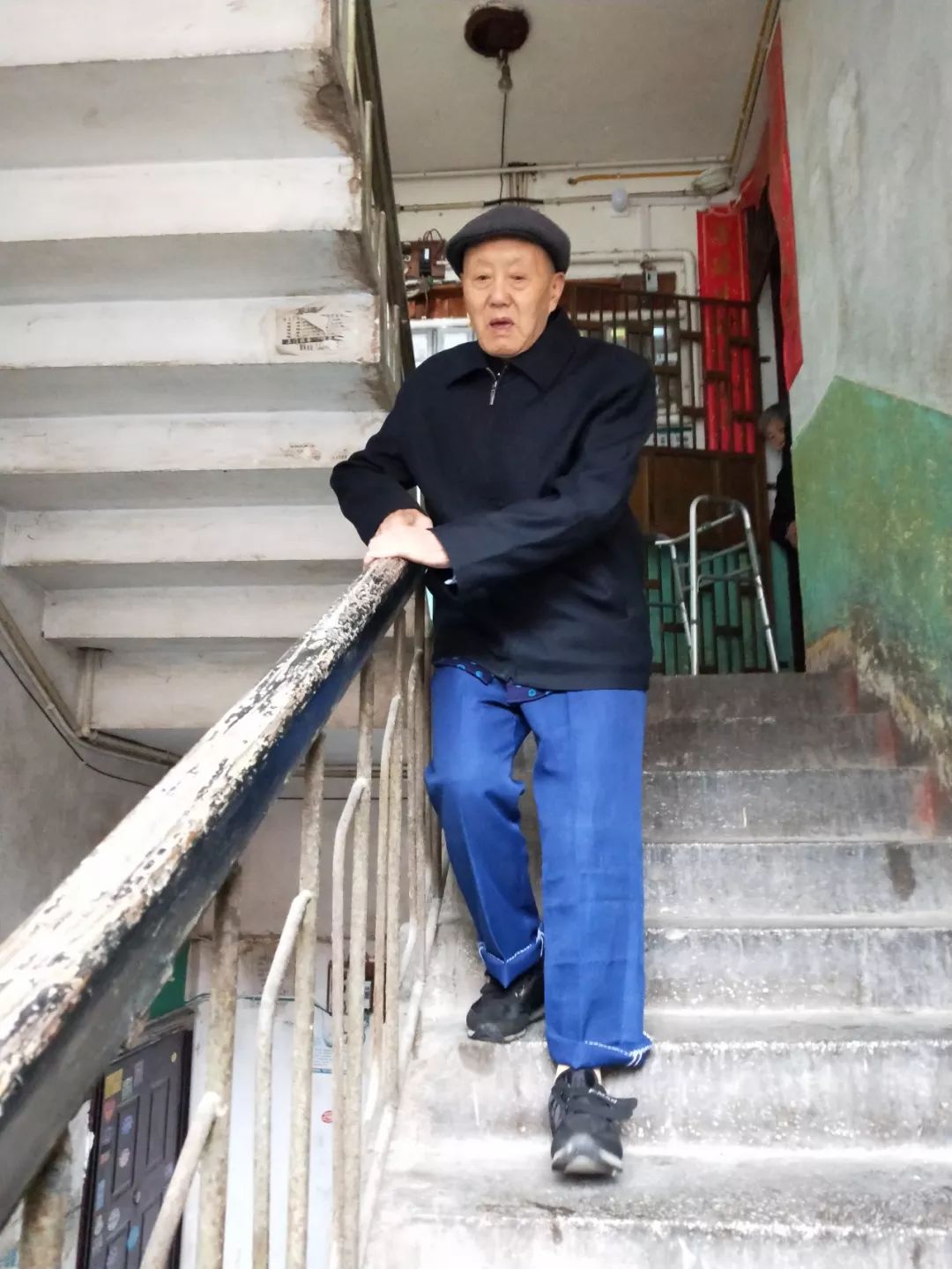 虽然腿脚不便,张富清仍每天坚持下楼锻炼(湖北日报全媒记者魏铼 通讯员朱勇 摄)