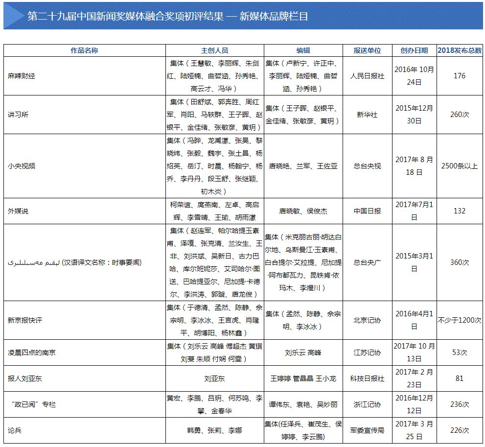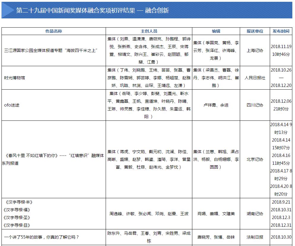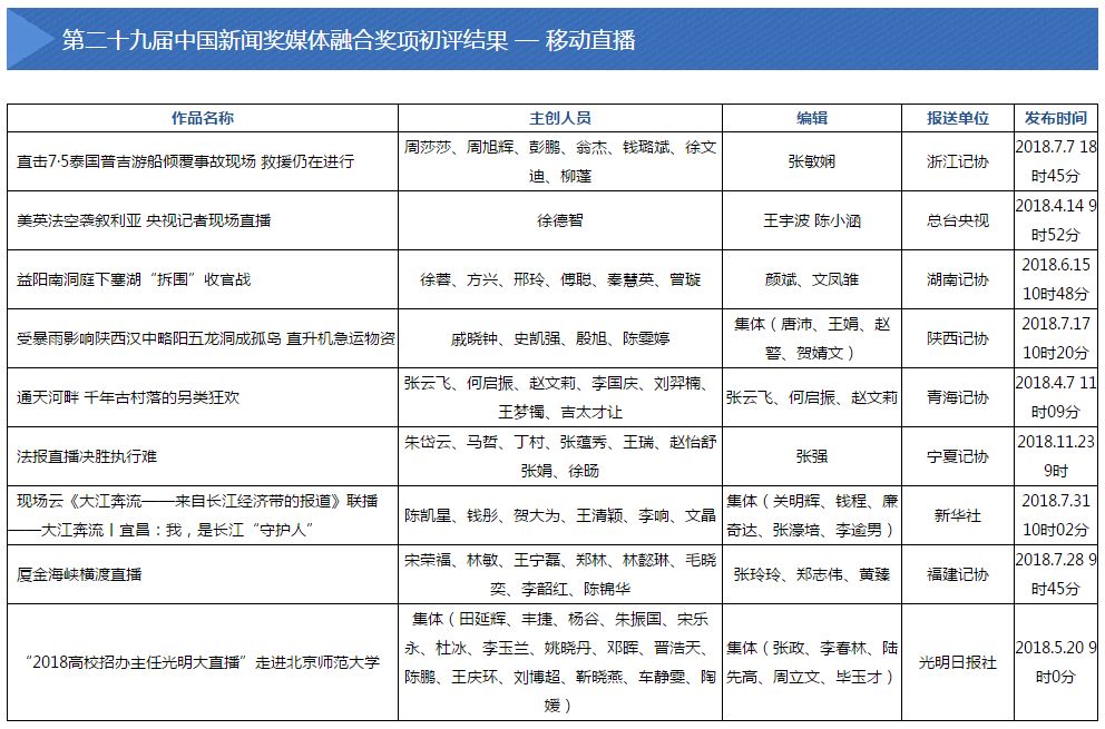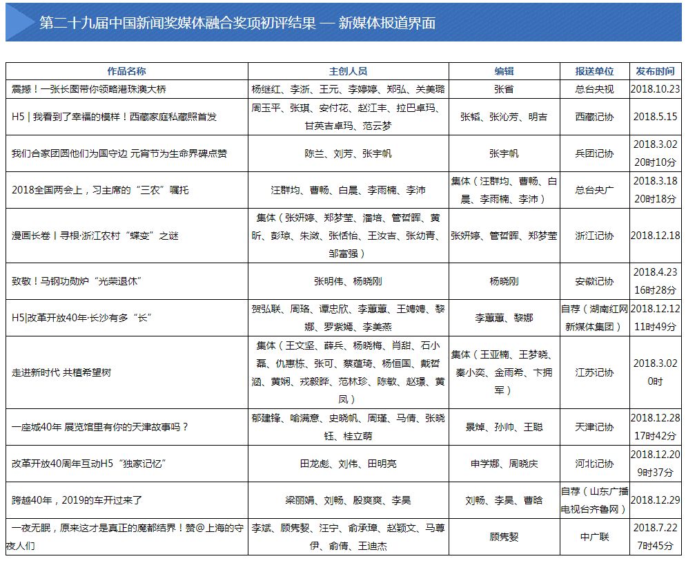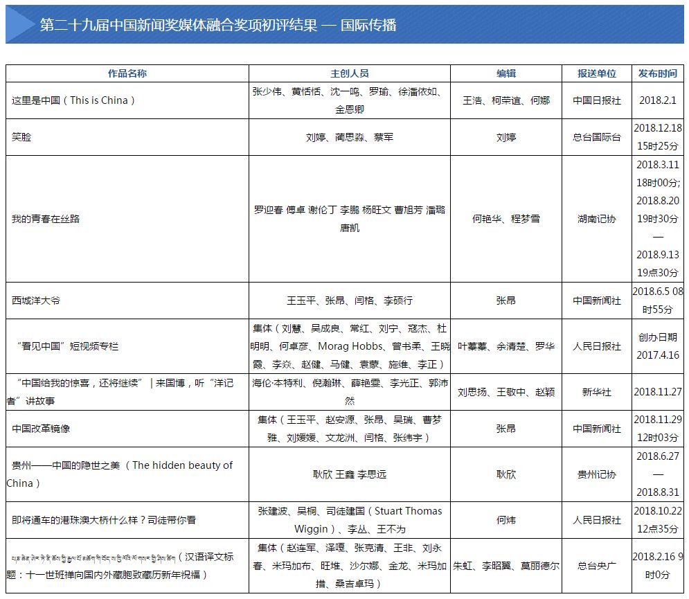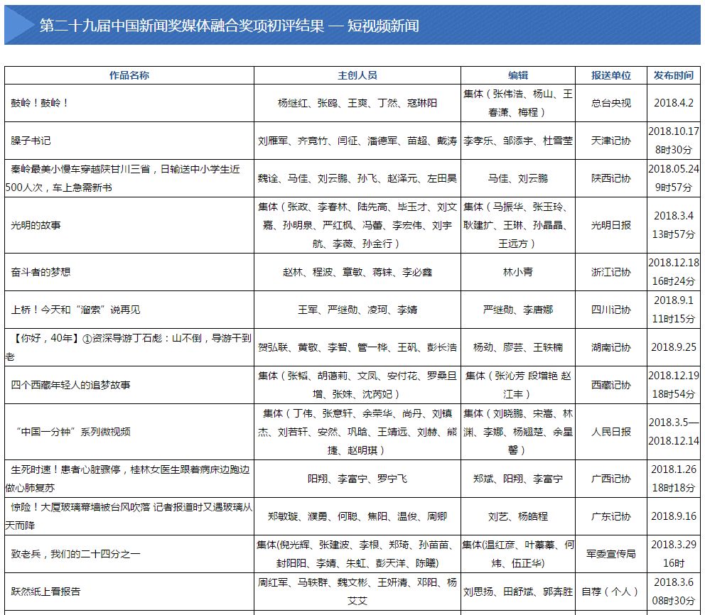 2019年5月28日至6月4日,中国记协新媒体专业委员会主办的第二十九届中国新闻奖媒体融合奖项初评会在京举行。会议评选出向中国新闻奖定评会推荐的候选作品110件,其中,短视频新闻31件,移动直播9件,新媒体创意互动14件,新媒体报道界面12件,新媒体品牌栏目10件,融合创新24件,国际传播10件。