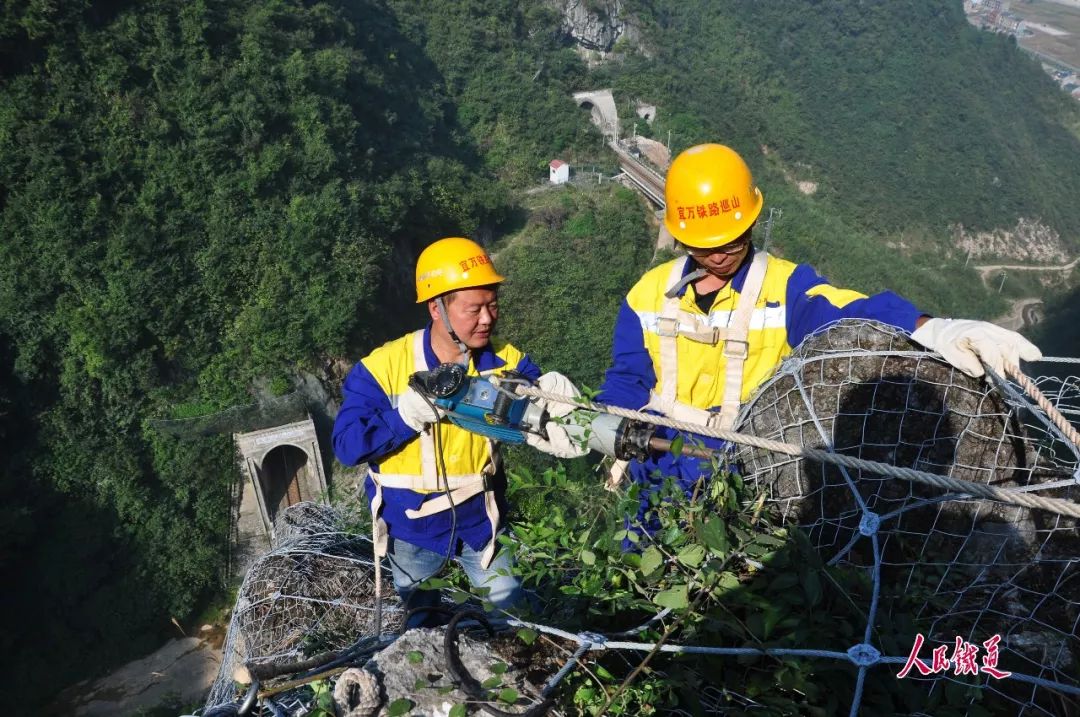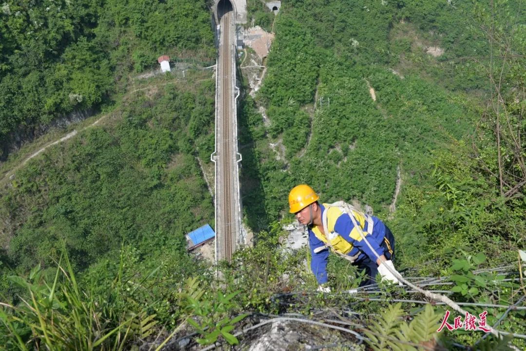 5月的武陵山区,绿树成荫,鸟语花香,山脚下的宜万铁路犹如一条长龙蜿蜒,一列列动车组穿山洞、越山谷呼啸而过,一个个黄色身影在悬崖峭壁间披荆斩棘、矫健攀爬,缚住可能松动脱落的危石,确保铁路运输安全畅通。