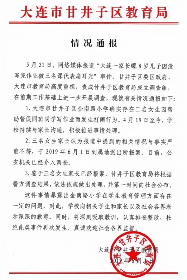 甘井子区教育局在通报表示,这件事情暴露出金南路小学在学生教育管理方面存在一定的问题,对此,学校向相关学生和家长以及社会各界表示深深的歉意。同时,将深刻吸取教训,认真排查整改,杜绝此类事件再次发生。真诚欢迎社会各界监督。