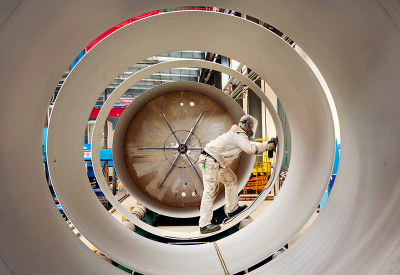 实体经济是我国经济发展、在国际竞争中赢得主动的根基。图为2019年3月14日,工人在江苏省南通市中集能源装备低温生产车间忙碌。去年年末,中集能源研发制造的130个液化天然气罐箱参与了国家创新LNG(液化天然气)运输方式试点项目,成为我国首次利用LNG罐箱进行“南气北送”的主角。 中新社发 许丛军/摄