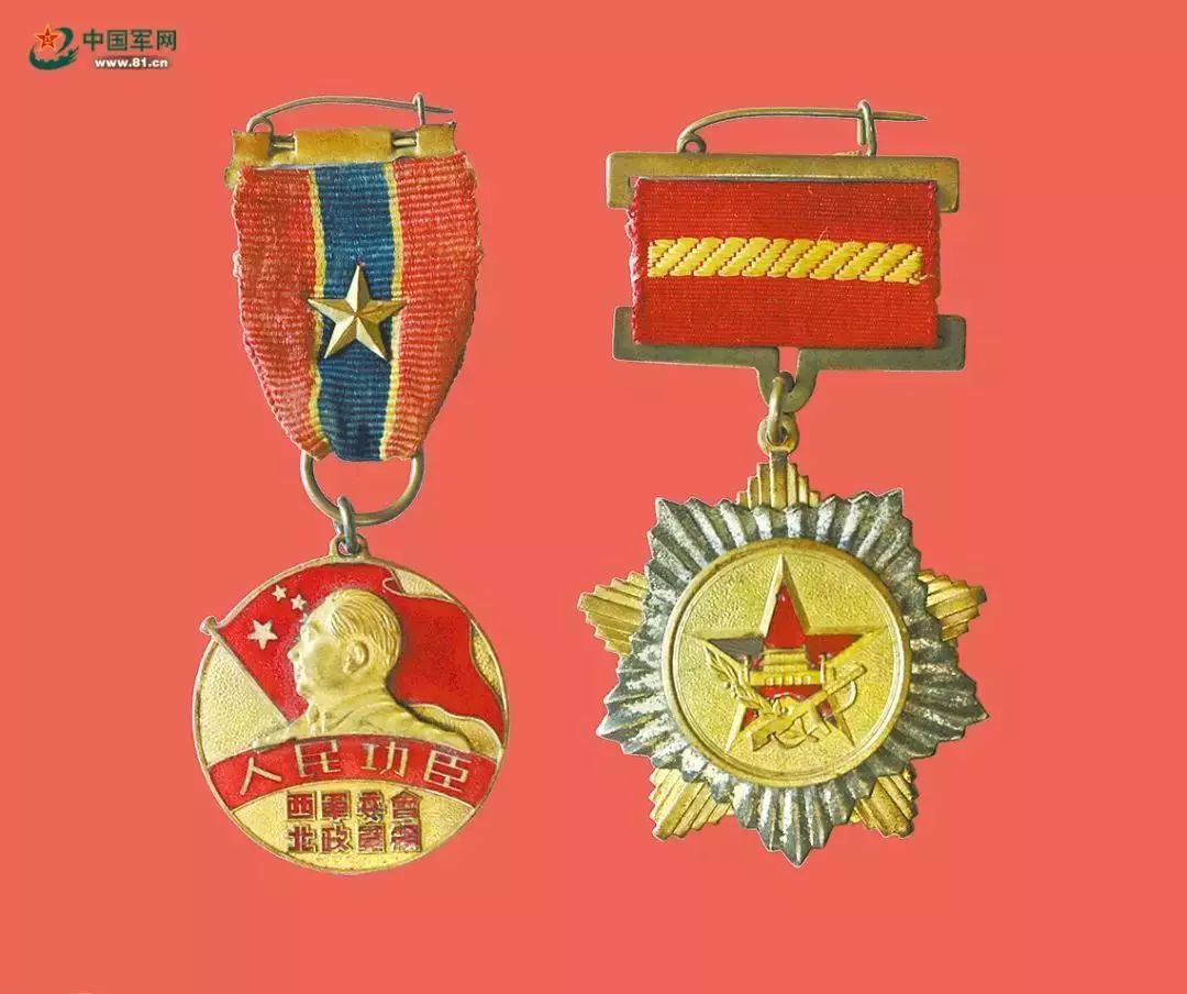 张富清获得的“人民功臣”奖章(左)和纪念章。