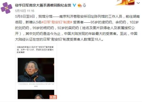 另据侵华日军南京大屠杀遇难同胞纪念馆官方微博5月10日消息,5月8日至9日,侵华日军南京大屠杀遇难同胞纪念馆分馆——南京利济巷慰安所旧址陈列馆的工作人员,在湖南岳阳新确认5名日军“慰安妇”制度受害者。至此,中国大陆经认证在世的日军“慰安妇”制度受害者人数增至18人。