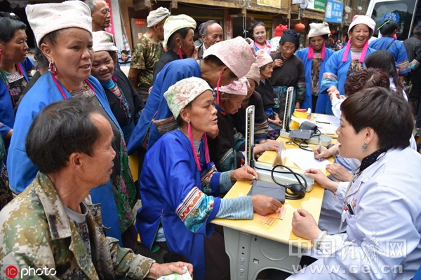 2019年5月14日,医护人员在贵州省榕江县计划乡加宜村为村民进行诊疗咨询。