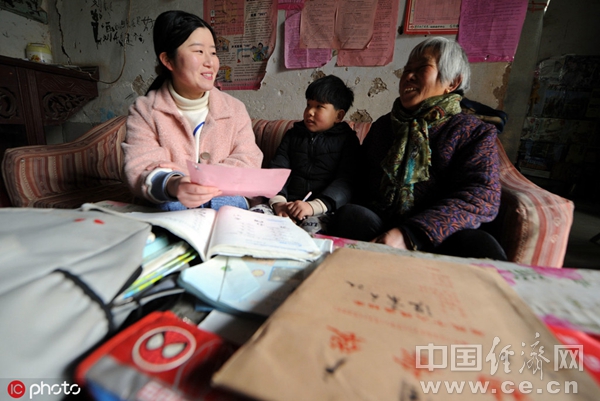 2019年1月6日,在安徽省亳州市涡阳县义门镇菜园村,教育扶贫联络员薛瑞雪(左一)正在贫困户家中宣讲教育扶贫政策。