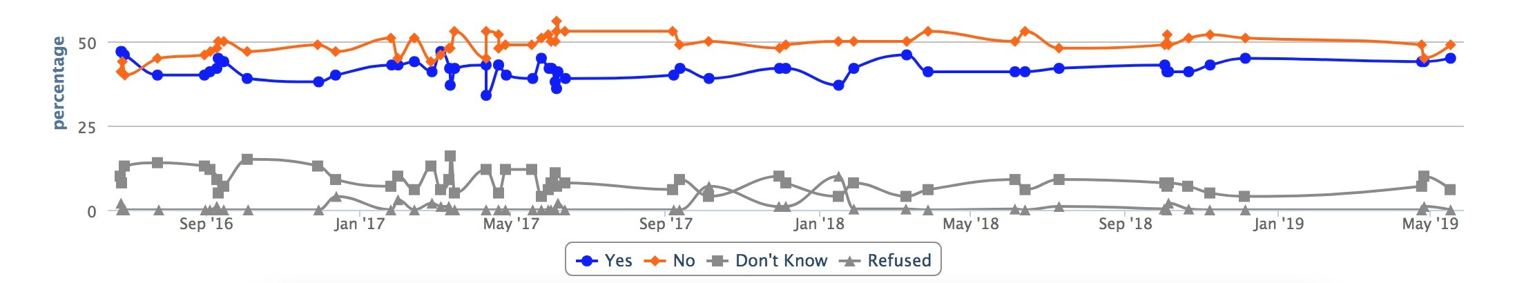 不过,从目前支持苏格兰二次独立公投的民调看,其已略高于2014年独立公投时支持独立的数据。2019年4月与5月的三次民调中,支持二次独立公投的数据分别是44%、44%、45%,反对的分别是49%、45%、49%,不明确的是7%、10%、6%,拒绝回答的是0%、1%、0%(下图中蓝色线表示支持,橙色线表示反对,灰色带方形线表示不明确,灰色带三角形线表示拒绝回答),若移除“拒绝回答”的数据,并假设“不明确”中支持和反对二次公投的人各占一半,那么支持二次公投的数据分别是47.5%、49%、48%,反对的则分别是52.5%、50%、52%。相较于2014年独立公投结果(44.7%支持,55.3%反对),目前的民调支持二次独立公投的略有提高,反对的略有下降。这是自2014年独立公投结束以来,支持独立的数据首次出现比较明显的提高。