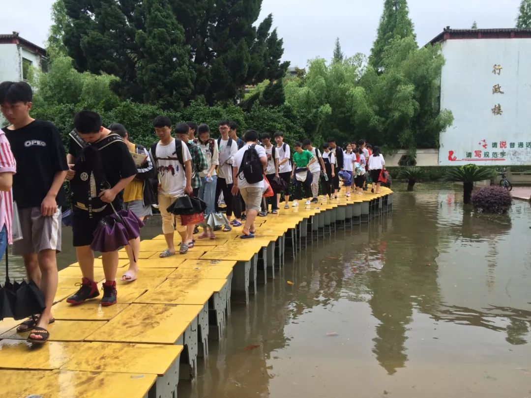 6月7日,在江西上饶市玉山县玉山一中考点内,考生们通过由课桌拼成的“浮桥”进入考场考试。新华社发