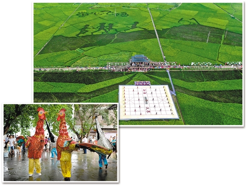 左图 民间艺人在德庆县悦城镇罗洪村为游人表演雄鸡舞。 新华社记者 陶 明摄