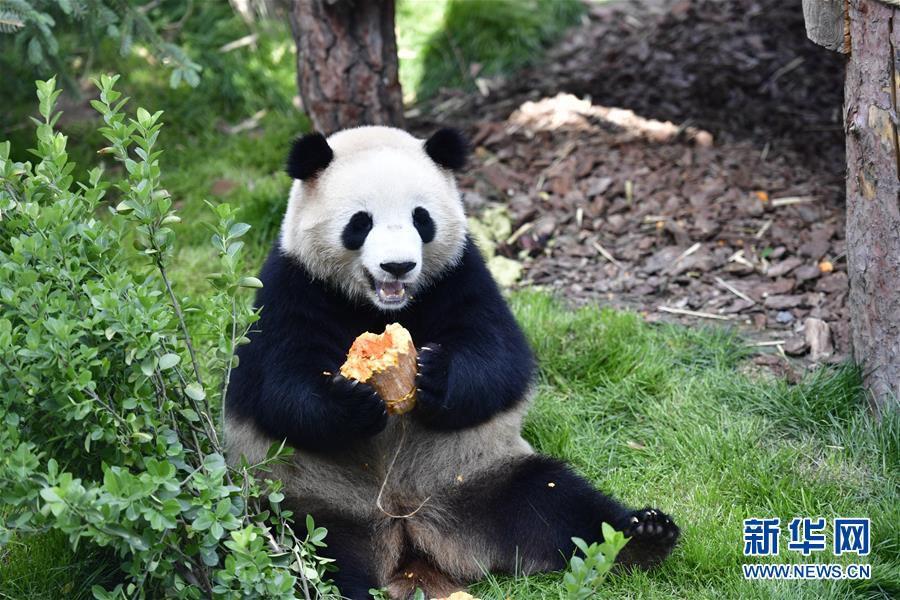 6月16日,大熊猫在西宁熊猫馆内吃南瓜。 新华社记者 张龙 摄