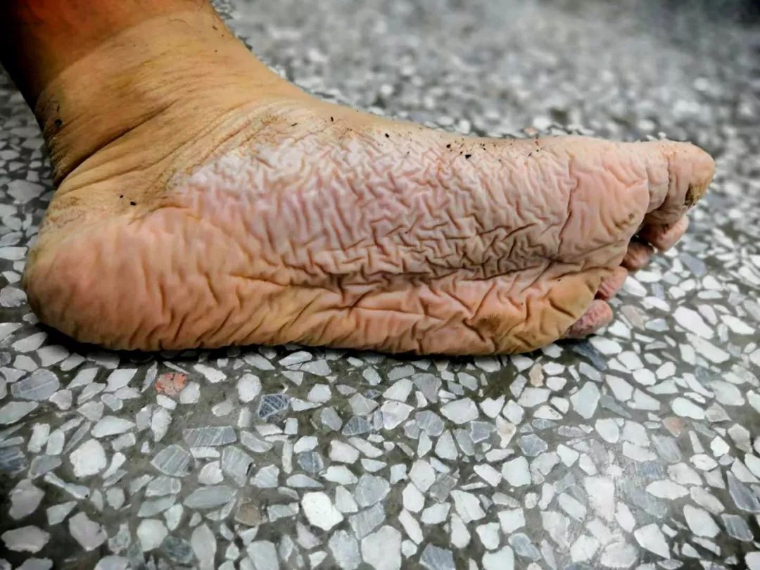 这个兵出生于2000年2月,2018年9月入伍。他这双发白、褶皱、浮肿变形的大脚,已经在水里断断续续泡了4天,像他这样的可不止一个人。