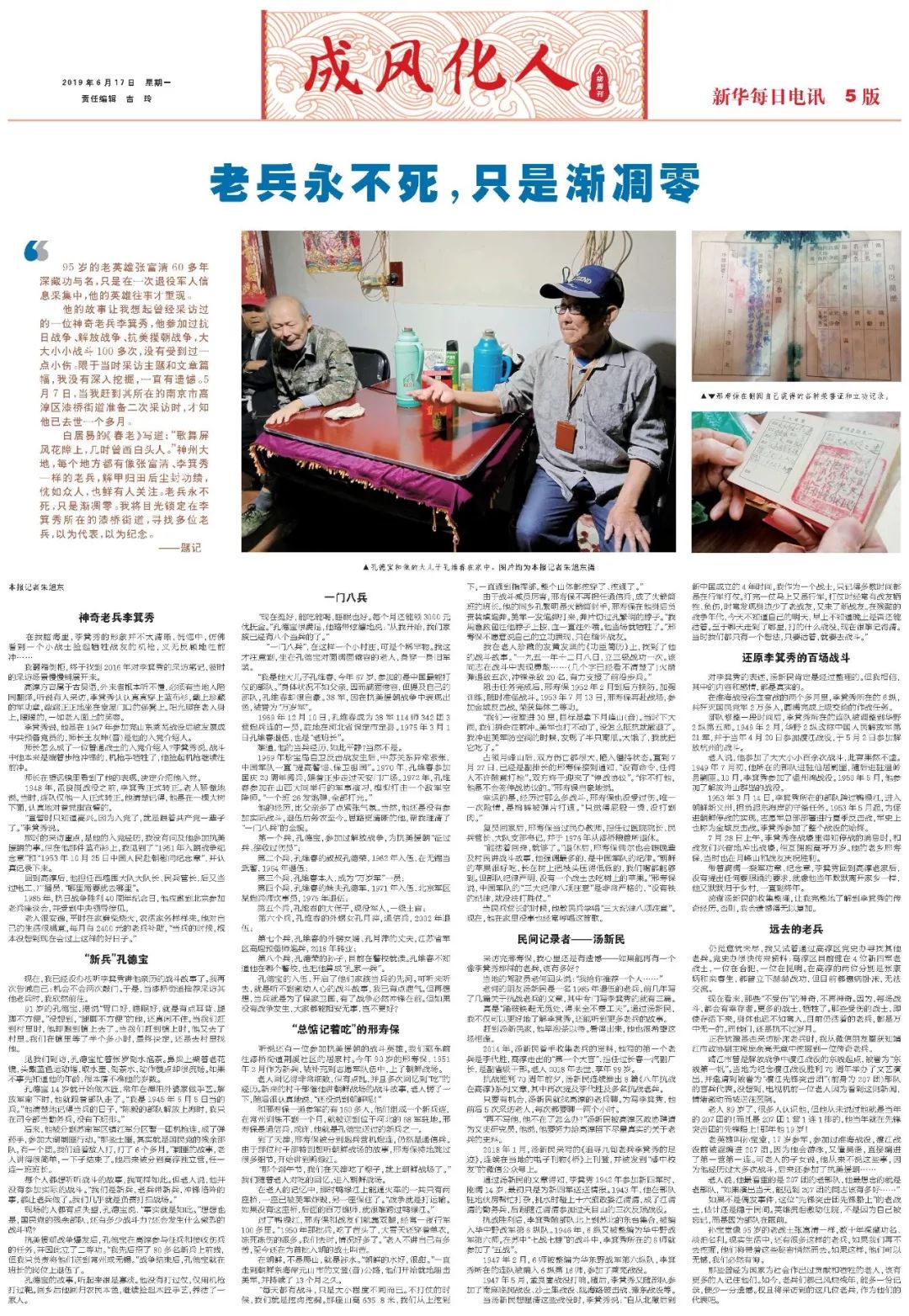 只要有机会,汤新民就找高淳的老兵聊。为写李箕秀,他前后5次采访老人,每次都要聊一两个小时。