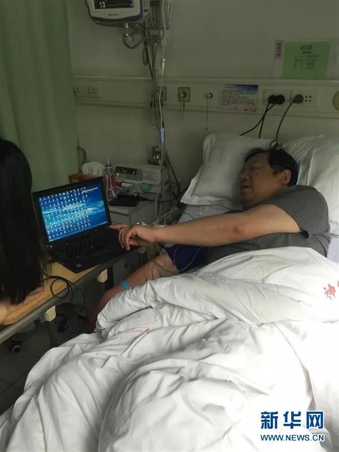 钟扬教授在病房与同事交接工作(2015年资料照片)。新华社发(复旦大学供图)