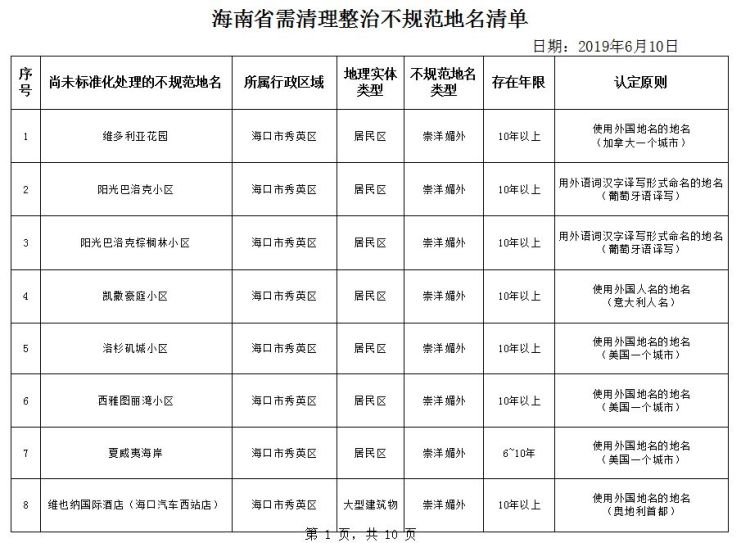 ↑海南省需清理整治不规范地名清单(部分)图片来源:海南省民政厅